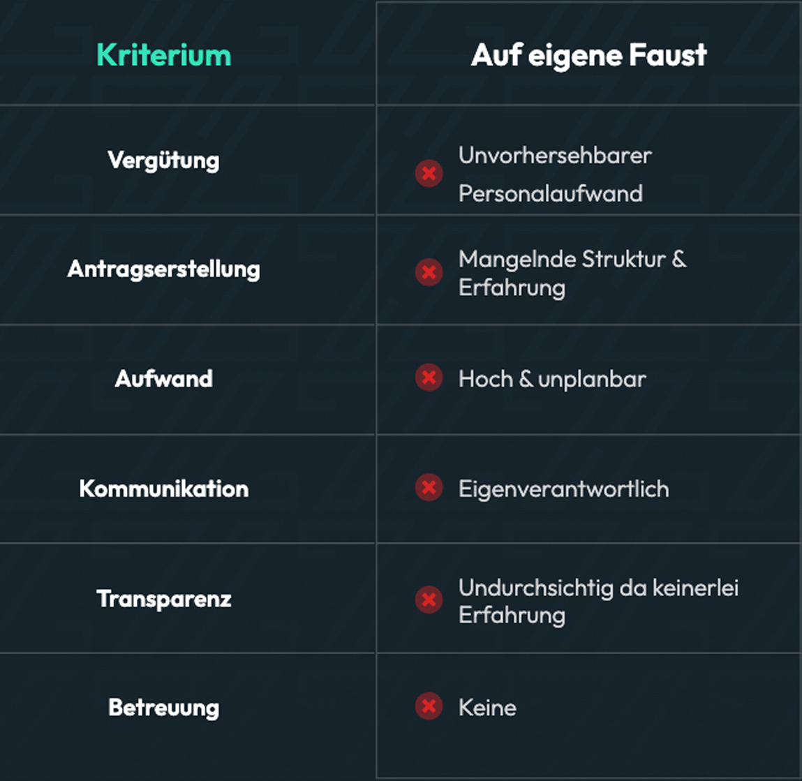 Wir übernehmen den gesamten Prozess für Sie und sorgen dafür, dass Sie die Förderung erhalten, die Ihnen zusteht. Mit minimalem Aufwand für Sie – und garantiert erfolgsbasiert.